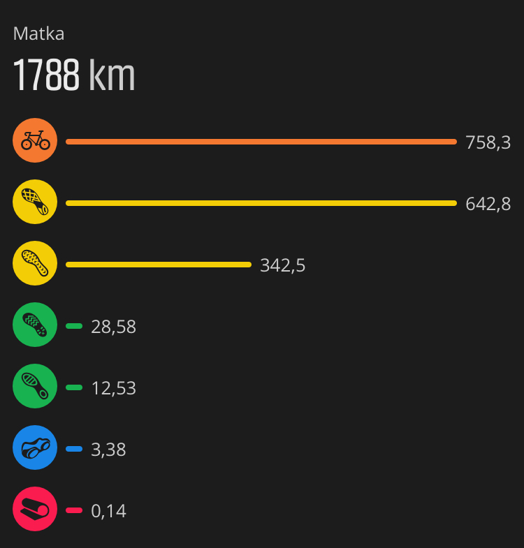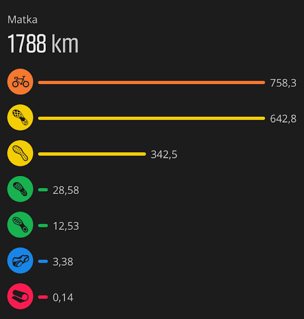 Tammikuu ja maaliskuu oli molemmat flunssakuukausia ja huhtikuussakin vielä joutui vähän varomaan. Siellä kilometrejä tuli yhdestä pidemmästä polkulenkistä huimasti, lähes puolet kuukauden saldosta.