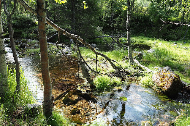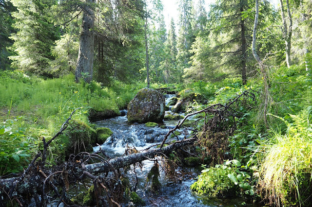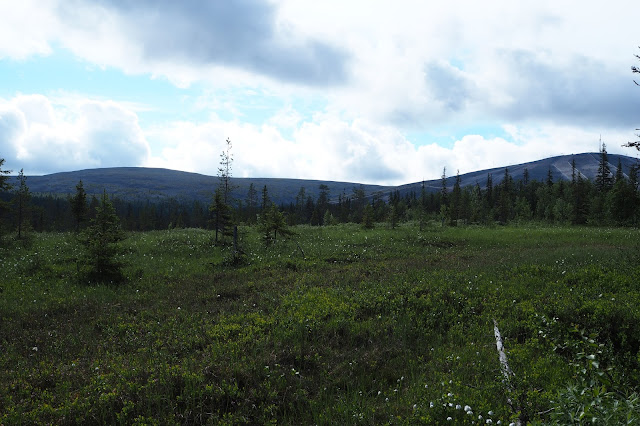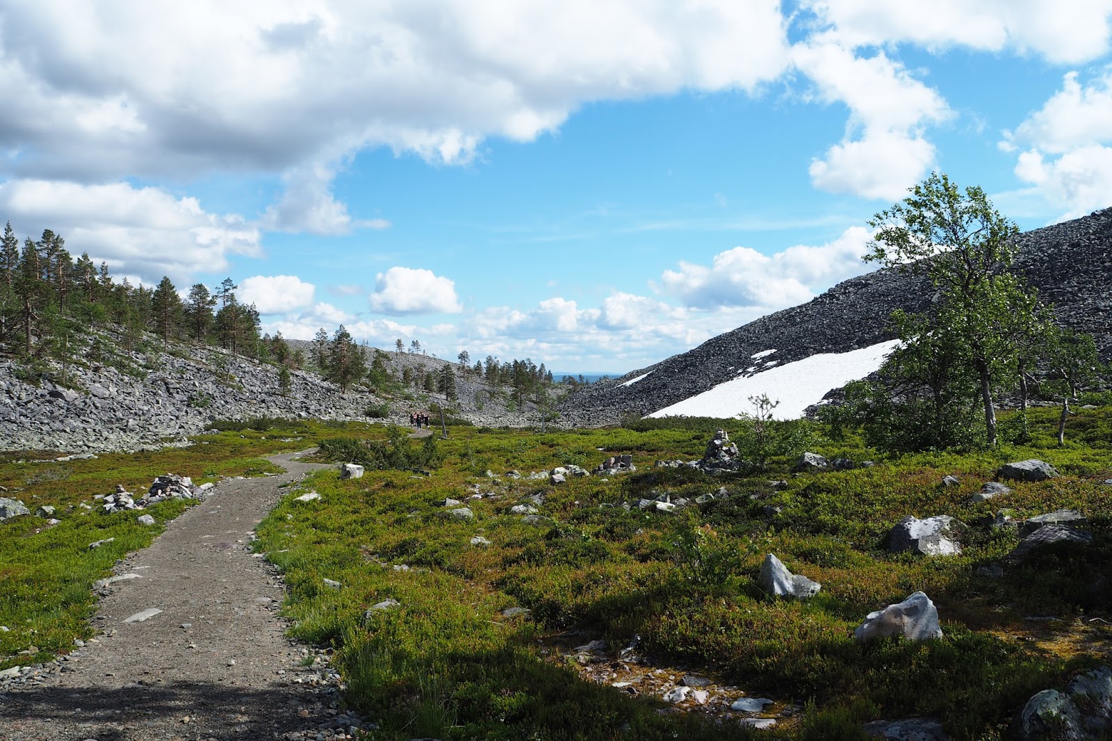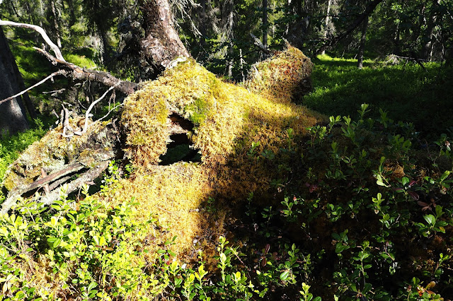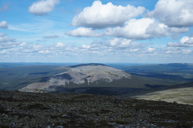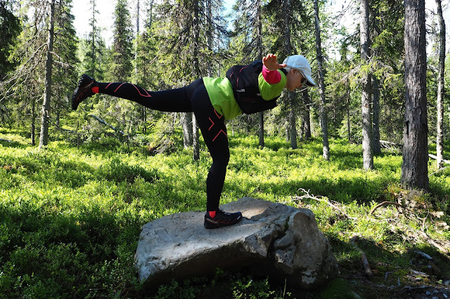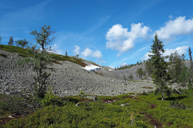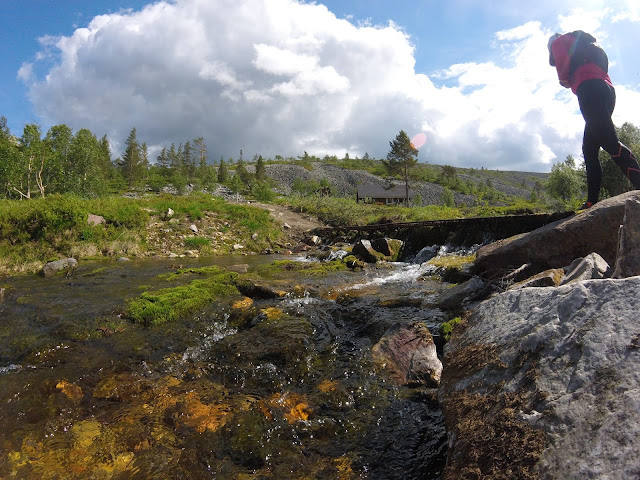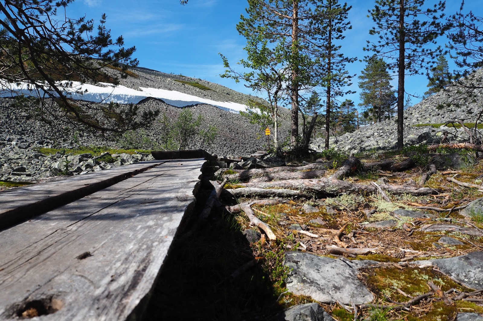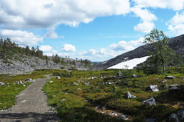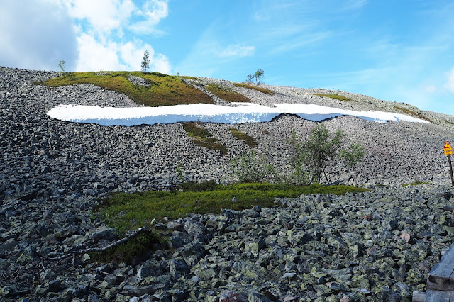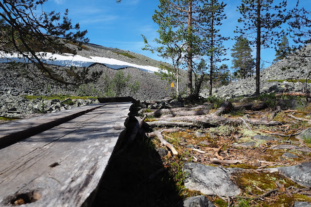 Miehen kanssa käytiin eilen kävelemässä tuolla samoilla poluilla joissa perjantaina juostaan. Tai ihan samoja ei välttämättä tullut kuin osittain, mutta vähän saatiin tuntumaa nousuihin ja laskuihin. Me lähdettiin matkaan Luontokeskus Kellokkaan pihasta ja tarkoituksena oli kävellä noin 9 kilometrin Seitakierroksen lenkki. Mahtavat maisemat ja kaunis luonto sai pysähtelemään ja ihailemaan moneen kertaan matkan aikana. Oli ihanan vihreää sammalikkoa ja tunturipuroja, vastakohtana karua kivikkoa ja jylhiä tunturimaisemia. Nähtiin vähän kauempaa Kesänkitunturi ja Pirunkuru, vähän lähempää Kellostapuli kivikkoisine rinteineen. Seitakierros kulki Kellostapulin ja Keskisen laen välistä pitkin kivikkoiseen rinteeseen rakennettuja pitkospuita ja portaita. Samalla paikalla nähtiin myös viime talvelta jääneet lumet. Tätä samaa pätkää taidetaan perjantaina juosta, mutta vastakkaiseen suuntaan.